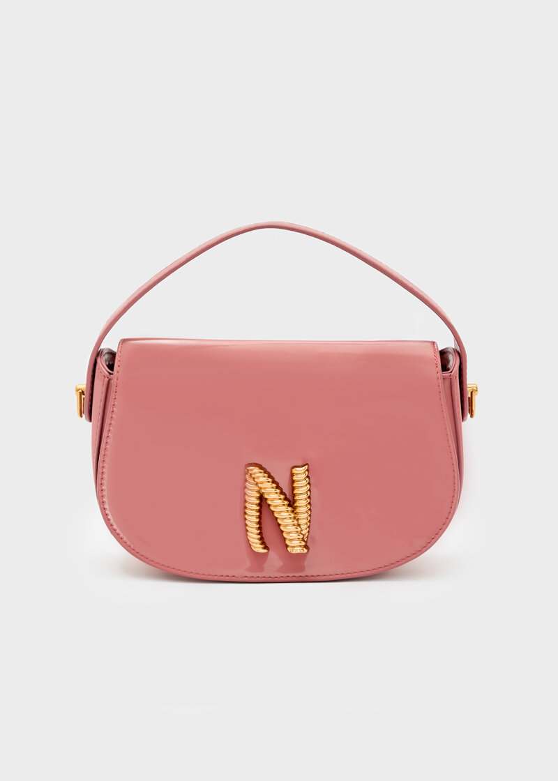 Borsa a spalla in vernice con logo N dorato, elegante e di tendenza.