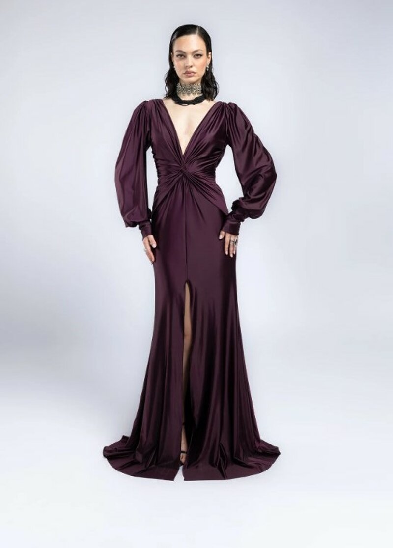 Eleganza e sensualità si fondono in questo abito lungo in jersey lucido color bordeaux. Il design con profonda scollatura a V sia sul davanti che sul retro esalta la femminilità con gusto, mentre le maniche lunghe a sbuffo e il drappeggio centrale valorizzano la silhouette con un tocco sofisticato. Lo spacco frontale aggiunge movimento e fascino a ogni passo. Perfetto per serate di gala, eventi esclusivi o cerimonie. Tessuto: jersey fluido e leggero. Vestibilità: aderente con taglio a sirena. Colore: bordeaux profondo