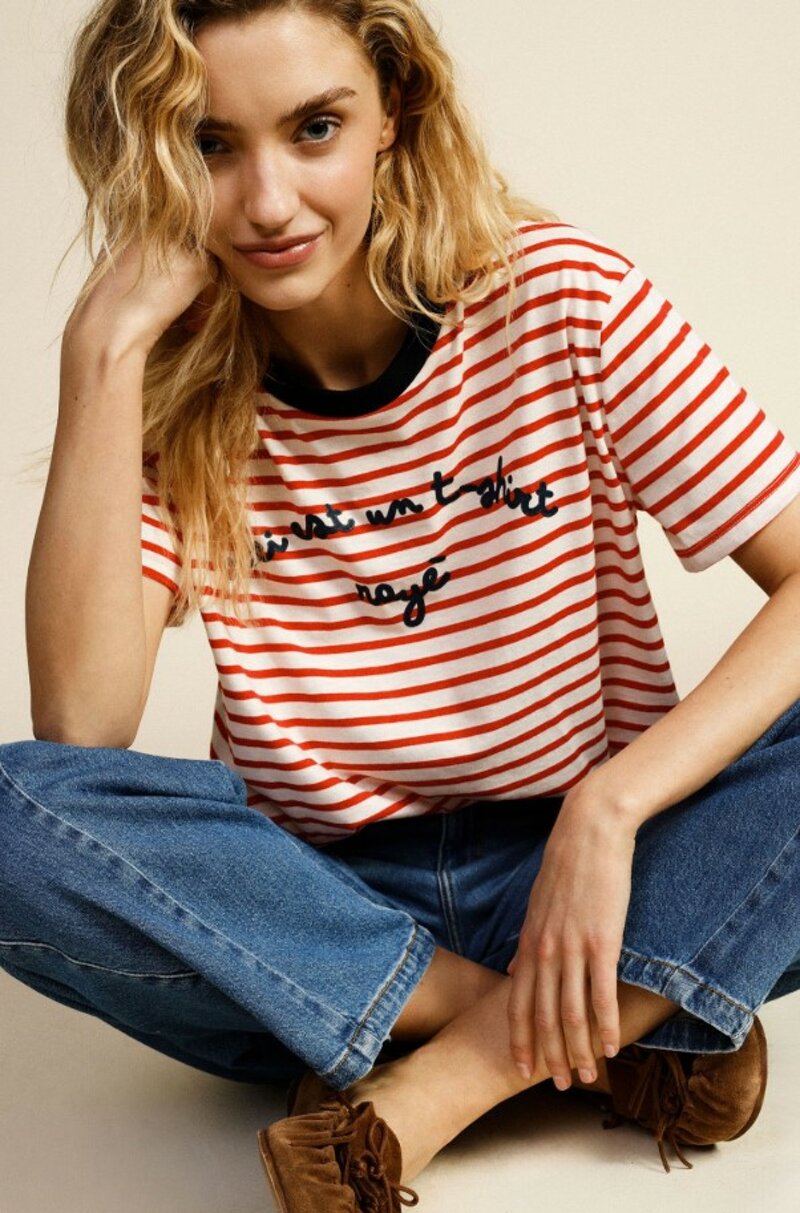 Trasforma ogni giornata con una t-shirt a righe dal taglio comodo e una scritta ricamata sul davanti. Il girocollo a contrasto aggiunge un tocco grintoso, perfetto da abbinare ai tuoi jeans preferiti. Un capo ideale per chi ama distinguersi, facile da indossare ogni giorno e sempre attento ai dettagli originali.