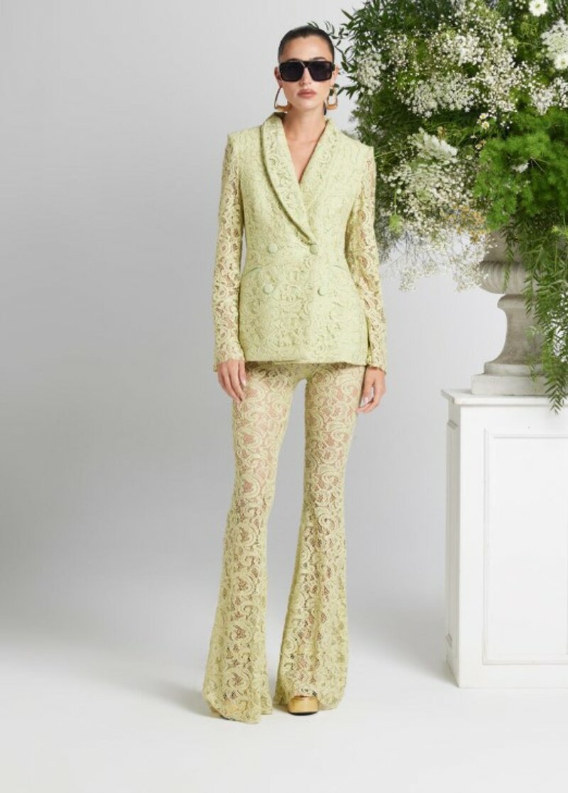 Illumina i tuoi eventi speciali con questo esclusivo tailleur firmato Dramée, un perfetto equilibrio tra sartorialità classica e glamour contemporaneo. Realizzato in un pregiato pizzo lavorato a motivo floreale, il tessuto è impreziosito da micro paillettes tono su tono che catturano la luce a ogni movimento.