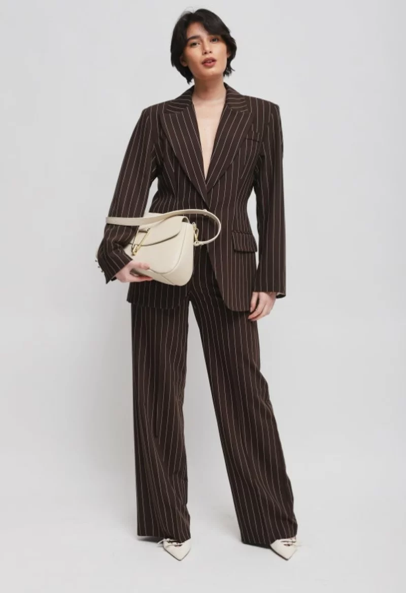 Capospalla versatile perfetto per set coordinati o spezzati. Descrizione tecnica: monopetto, spalline imbottite, tasca filetto, tasche patta. Pantaloni gessati a gamba larga, il taglio fluido a vita alta slancia la silhouette, garantendo comfort e uno stile professionale impeccabile. Tasca all' americana, tasca filetto sul retro